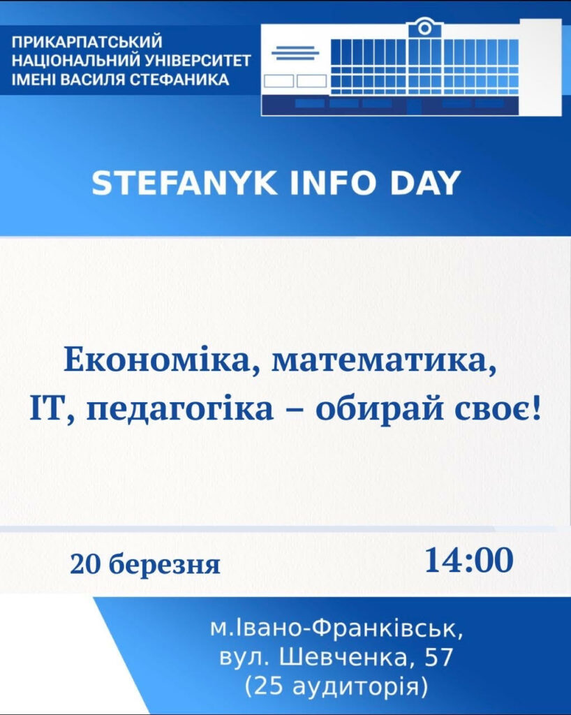 Економічний факультет Прикарпатського національного університету імені Василя Стефаника запрошує учнів 9-11 класів на економічний форум “Від теорії до практики. Секрети успіху”! 25 березня 2025 року о 14:20 м. Івано-Франківськ, вул. Шевченка, 57 (вхід з вулиці Чорновола, Центр інноваційних освітніх технологій Читати далі