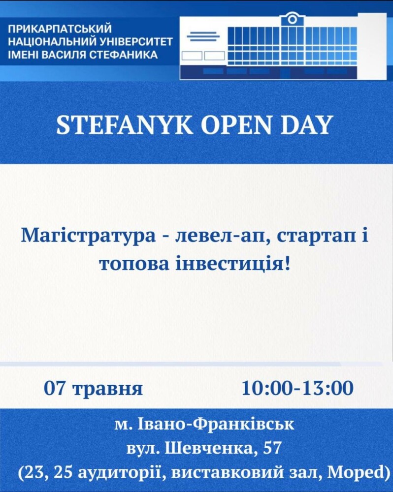 7 травня 2025 року з 10 до 13 години у Прикарпатському (Карпатському університеті імені Василя Стефаника) відбудеться STEFANYK OPEN DAY — подія для студентів, які планують продовжити навчання на другому (магістерському) рівні. До участі запрошуються студенти 4 курсу, випускники бакалаврату Читати далі