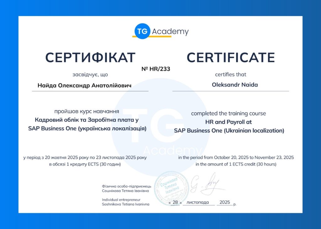 28 листопада 2025 року асистент кафедри обліку і оподаткування, здобувач освіти третього навчально-наукового рівня вищої освіти Карпатського національного університету імені Василя Стефаника Найда Олександр Анатолійович успішно завершив навчання та отримав сертифікат від TG Academy за курсом «Кадровий облік та Заробітна Читати далі