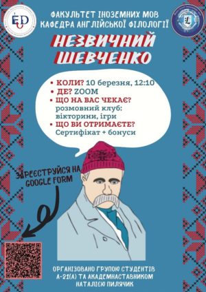 Студенти та викладачі факультету іноземних мов проводять для школярів Івано-Франківщини творчий онлайн-захід “Незвичний Шевченко”. Захід відбудеться 10 березня о 12:10 год. Учасники міні-проєкту зможуть не лише подивитися на творчість Тараса Шевченка по-новому, очима сучасних студентів, а й вперше обговорити всі Читати далі